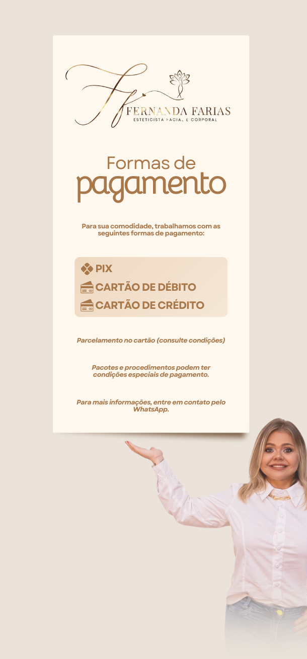 Meu nome é Fernanda Farias e sou Técnica em Estética, profissional na área de estética facial e corporal, apaixonada por transformar autoestima em bem-estar real. Atualmente, estou no último ano da faculdade de Estética e Cosmética, sempre em busca de atualização, conhecimento e excelência nos atendimentos.